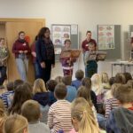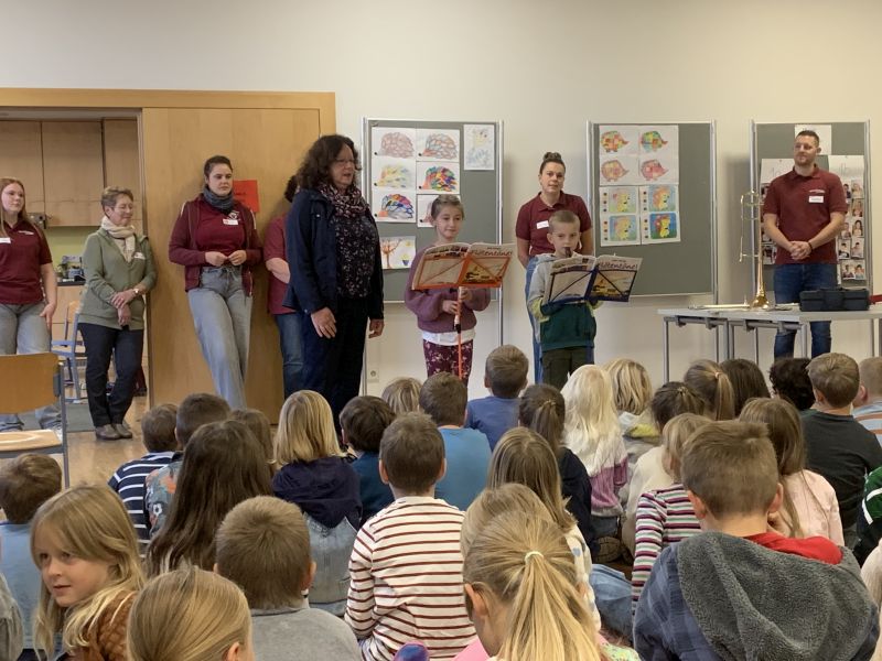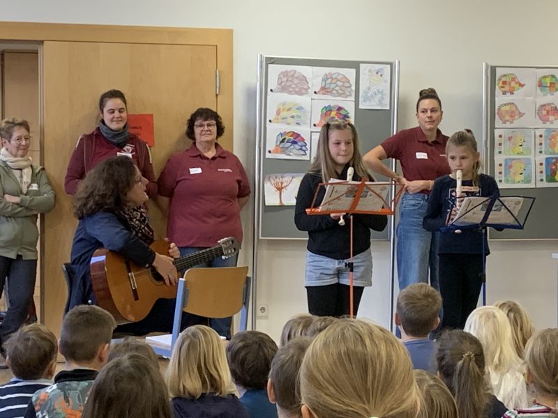 Zur Begrüßung spielten zuerst unsere Flötenkinder unter der Leitung von Frau Nutto vor der ganzen Schule. Die können es schon richtig gut ! Seit zwei Jahren haben wir eine Kooperation mit den beiden Musikvereinen.