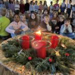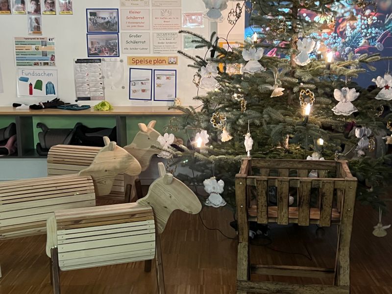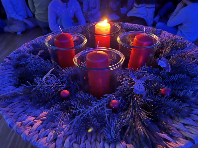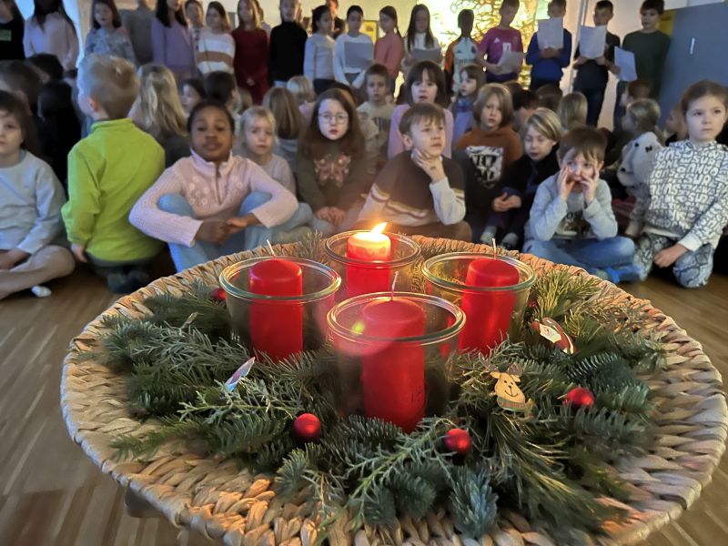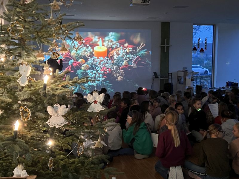 Immer freitags in der 1. Stunde treffen wir uns in der Aula zur gemeinsamen Adventsfeier. Gemeinsam wird gesungen und wir üben die Lieder für unser Weihnachtsmusical. Danach gibt es ein Bilderbuchkino. Die Lehrer lesen die Geschichte vor.